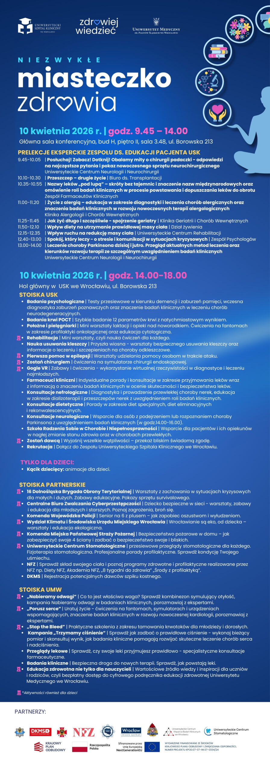 w imieniu Zespołu Pozapiramidowego Kliniki Neurologii USK we Wrocławiu i Zarządu TWK-Wrocław, serdecznie zapraszamy osoby chorujące na chorobę Parkinsona oraz ich bliskich i wszystkich zainteresowanych do udziału w wydarzeniu „Niezwykłe Miasteczko Zdrowia”, które odbędzie się w piątek 10 kwietnia 2026 r. w Uniwersyteckim Szpitalu Klinicznym we Wrocławiu ul. Borowska 213.
